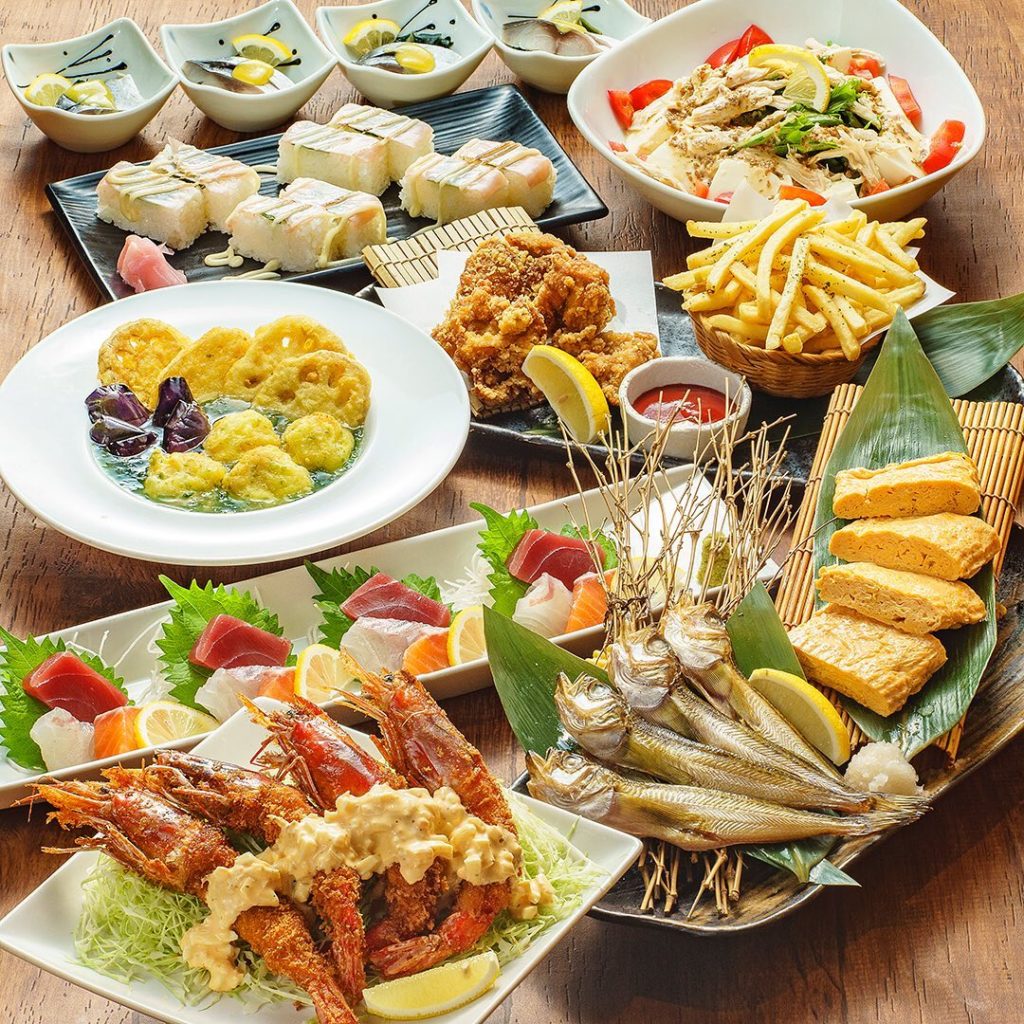 秋冬の飲み放題コース登場! 有頭エビフライとハタハタ一夜干し3500円コース全9品 ・季節の小鉢・旬魚お造り3種盛り・蒸し鶏と豆腐のサラダ🥗セサミンたっぷりゴマ…