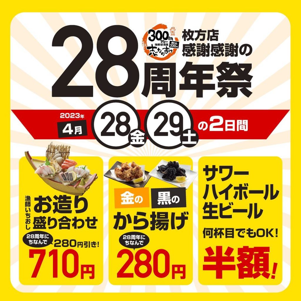 志なのすけ28周年祭り★4月28日・29日 本日と明日、志なのすけ枚方店では28周年祭り開催! 漁師いちおしお造り盛り合わせ990円⇒710円 金のから揚げ・黒…