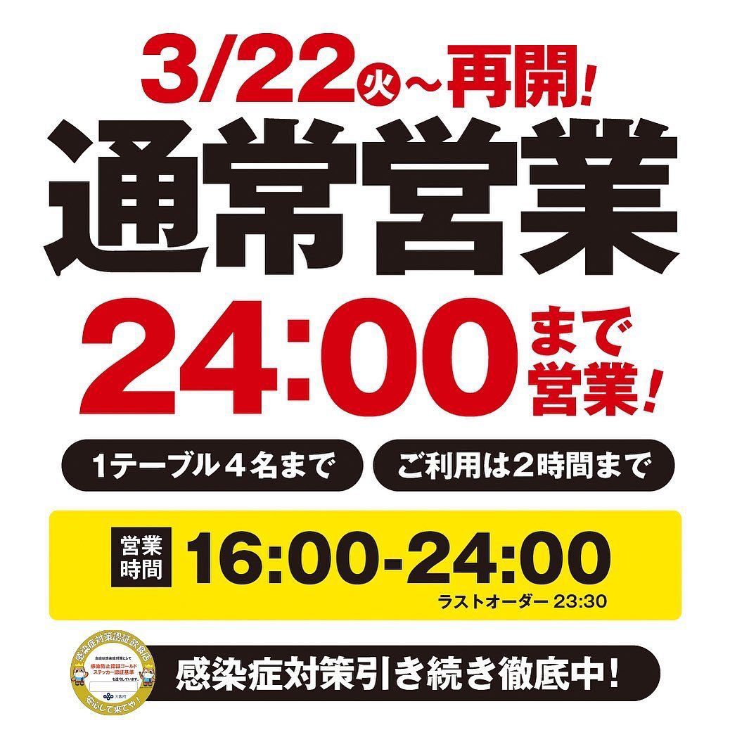 #通常営業 に戻りました~やったね大阪府のまん延防止解除にともない通常営業に戻ります♪営業時間16:00~24:00(LO23:30)#志なのすけ京橋店 はゴールドステッカー認証店です・1テーブル4人まで・滞在時間2時間程度にご協力ください本物の春が来ましたね🥰これで気兼ねなく飲んでいただけるご来店お待ちしています#居酒屋京橋志なのすけ #京橋グルメ #京橋飲み #海鮮居酒屋 #食べ放題 #飲み放題 #食べ飲み放題 #刺身 #日本酒 #京橋はええとこだっせ
