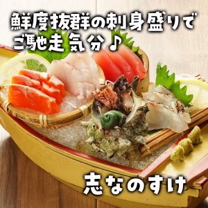 志なのすけ自慢の旬魚お造りと有頭エビフライがメインのプランです