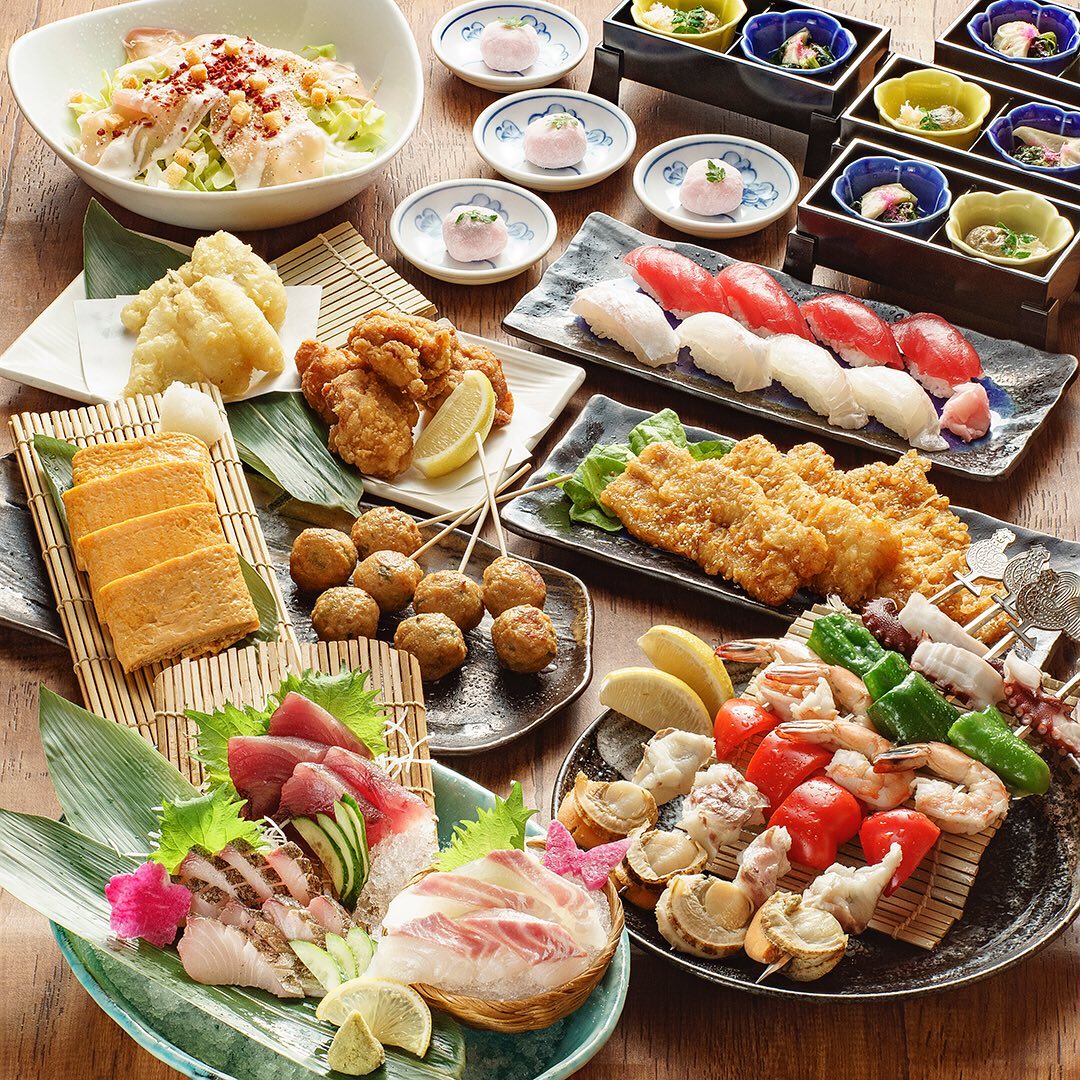 海鮮もりもり串焼きと初カツオお造り4000円コース