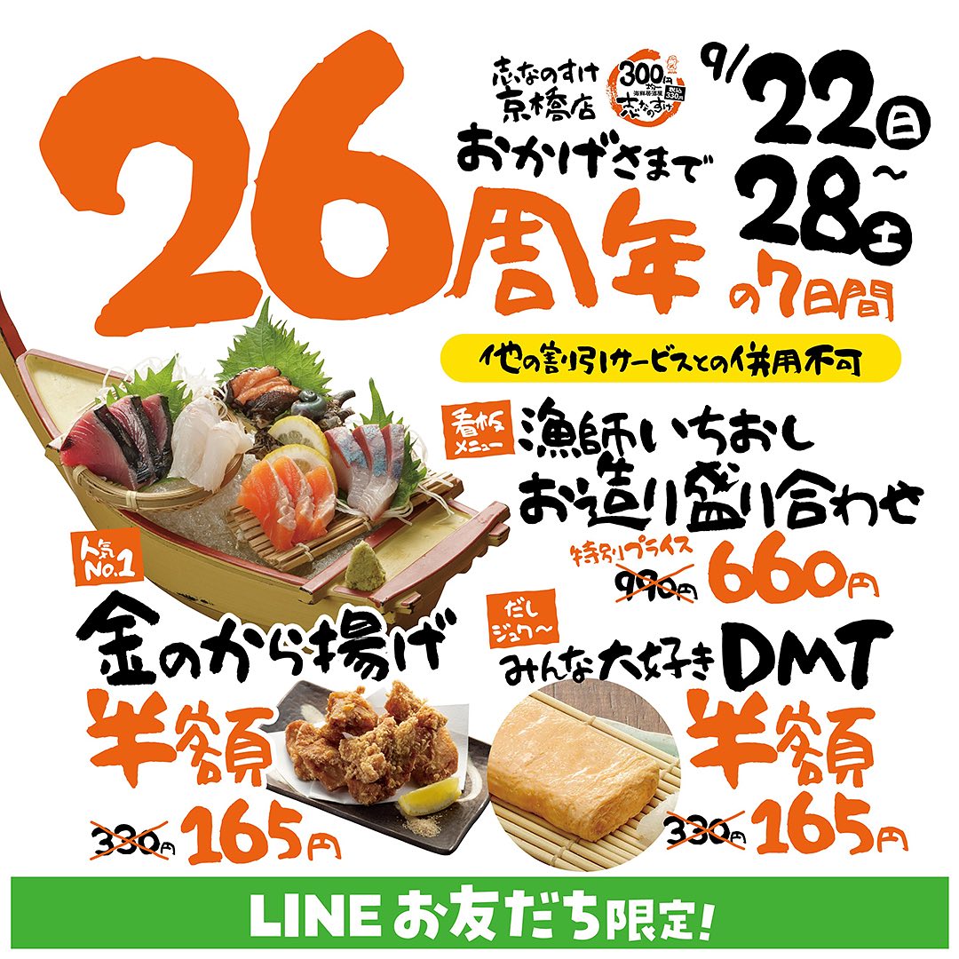 【志なのすけ京橋店が26周年】超特価の1週間です!9月22日(日)~28日(土)、明日から1週間、LINE会員さん限定で志なのすけの名物料理がお得プライスに漁師いちおしお造り盛り合わせ1人前990円⇒33%OFF!の660円🐓金のから揚げ330円⇒半額!の165円みんな大好きDMT(だし巻玉子)330円⇒半額!の165円LINE会員になるのはその場で簡単にできますもちろん料金はかかりませんふだんからお安い志なのすけがこの1週間はさらにお安くなっちゃいます新鮮鮮魚と自慢のから揚げ&だし巻食べに来てください🥰@si.kyobashi#志なのすけ京橋 #京橋居酒屋 #京橋居酒屋安い #海鮮 #半額セール #26周年