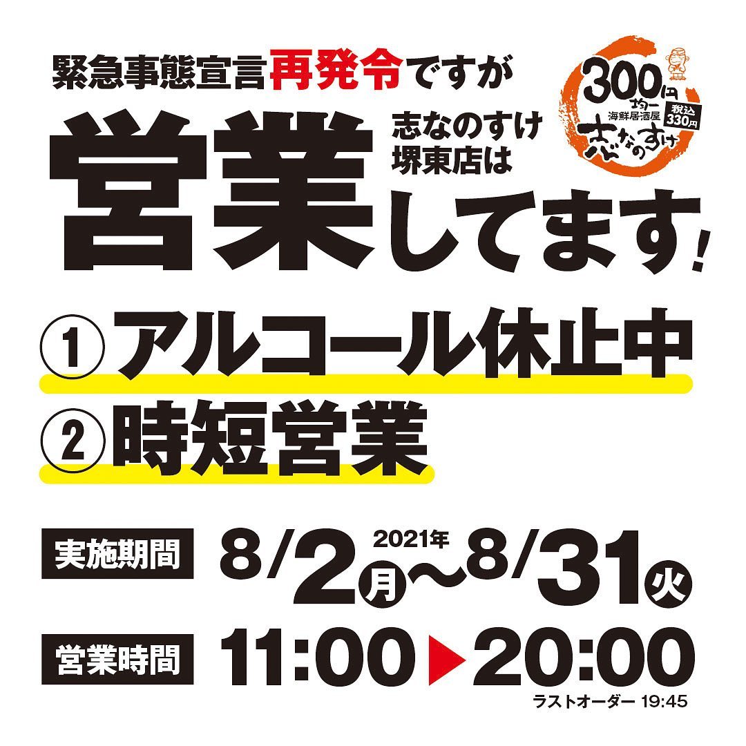 緊急事態宣言再発令にともない8月31日(火)まで「時短営業」11時~20時まで(ラストオーダー15分前)期間中、アルコールの提供は休止となりましたせっかくアルコールが復活して楽しい時間を過ごしていただいていたのに残念です♂️でも大阪の安心・安全のため要請を遵守してまいります居酒屋メニューはもちろんランチ・晩ご飯のお食事やテイクアウトウーバーイーツによるデリバリーも続けますこれからもよろしくお願いします#志なのすけ堺東店 #志なのすけ