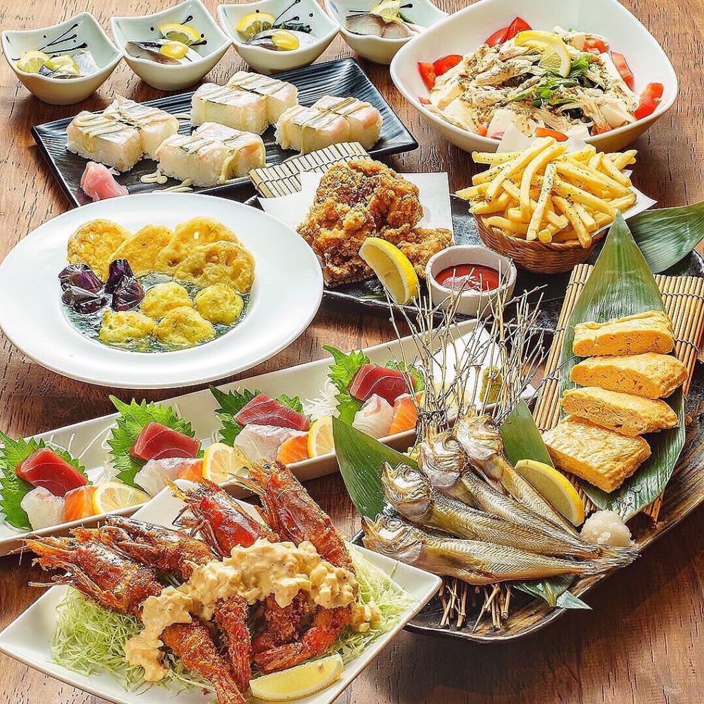 秋冬の#飲み放題コース 登場! 有頭エビフライとハタハタ一夜干し3500円コース全9品 ・季節の小鉢・旬魚お造り3種盛り・蒸し鶏と豆腐のサラダ🥗セサミンたっぷり…