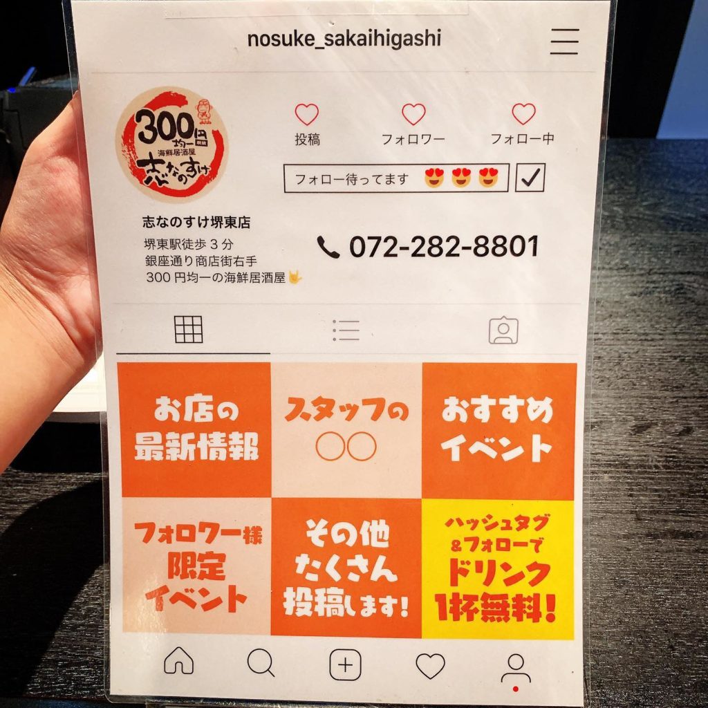 .志なのすけ堺東店 インスタグラムをフォロして下さってる方、いいねを下さる方 いつも有難うございます .感謝の気持ちを込めて、フォロー&ハッシュタグ付き投稿でドリンク1杯サービス させて頂きます 既にフォロワーの方は、ハッシュタグ投稿のみでOK!!!(/ω\).御来店いただいた際に画面表示よろしくお願いします️..072-282-8801#志なのすけ #志なのすけ堺東店 #ドリンクサービス #ubereats #テイクアウト#堺東グルメ #海鮮 #海鮮居酒屋 #飲み放題 #食べ放題 #堺東 #銀座通り #堺東居酒屋 #居酒屋 #がし呑み #300円均一 #宴会 #忘年会 #新年会 #送迎会 #デート #ちょい飲み #サシ飲み #同窓会 #定期会 #バースデー