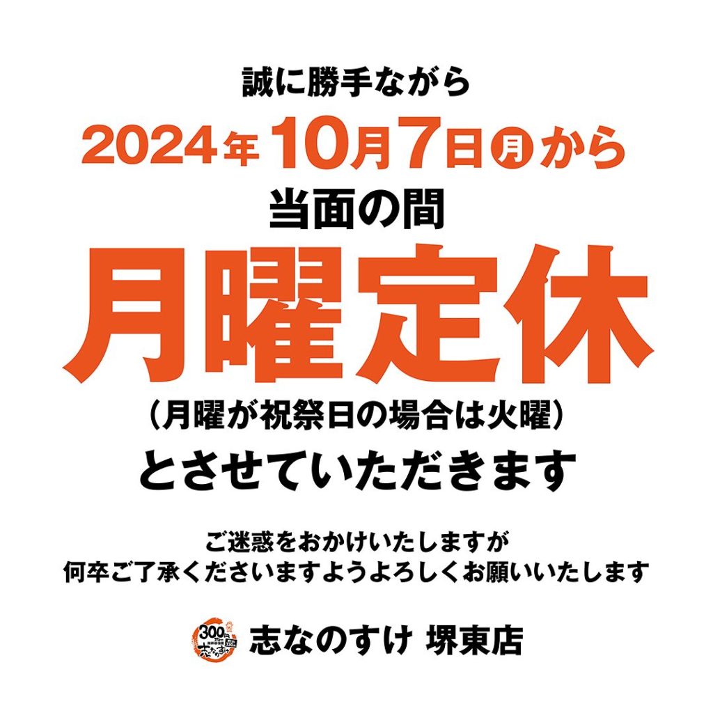 来週より「月曜定休」★志なのすけ堺東店