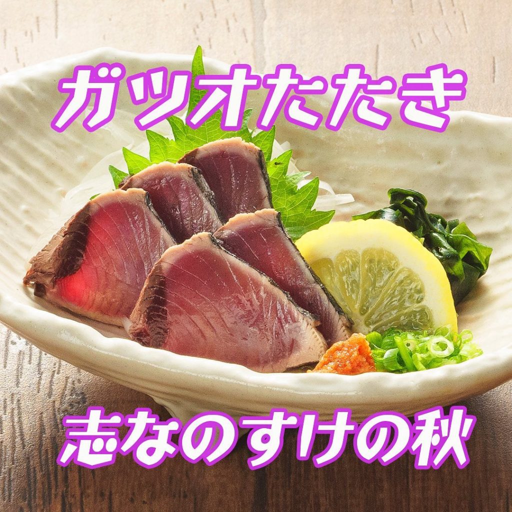 秋メニュー始まりました志なのすけ/宴会/大人数/貸切 この秋の海鮮は「カツオ」と「サーモン」さ~、どれからいっときましょう カツオたたき/表面を炙って香ばしく3…