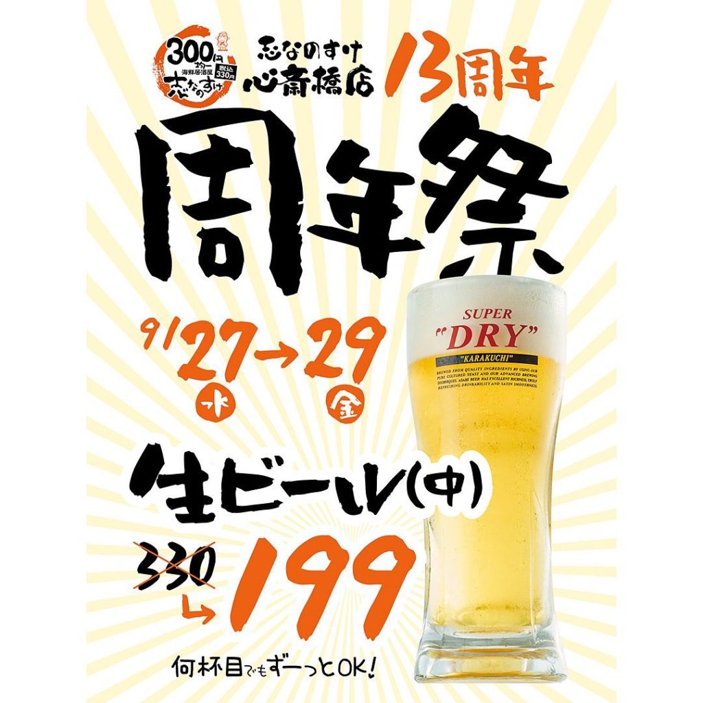祝!13周年【生ビール199円】9/27~29★志なのすけ心斎橋