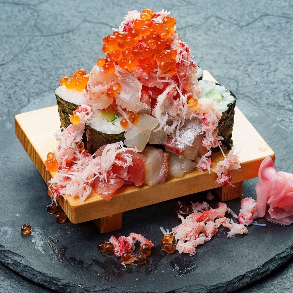 志なのすけ心斎橋店のお寿司がリニューアル♪お手頃プライスになりました イチオシはこれ! 海鮮こぼれ寿司990円🦀 かっぱ巻の上にてんこ盛りの海鮮をこれでもかと積…