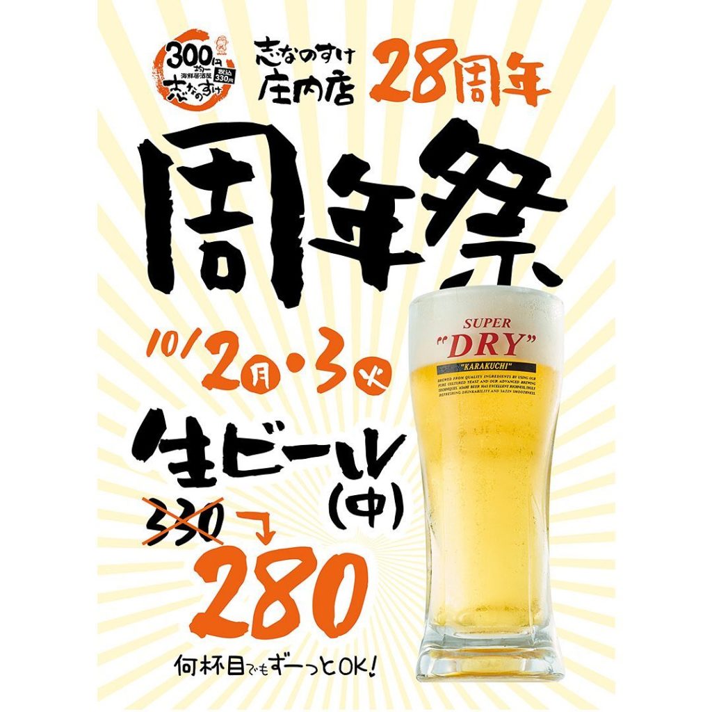 ■祝!28周年【生ビール280円】10月2日(月)・3日(火) 今日と明日の2日間、志なのすけ庄内店は「28周年祭り」を開催!ご愛顧くださった感謝を込めて🥰 生…
